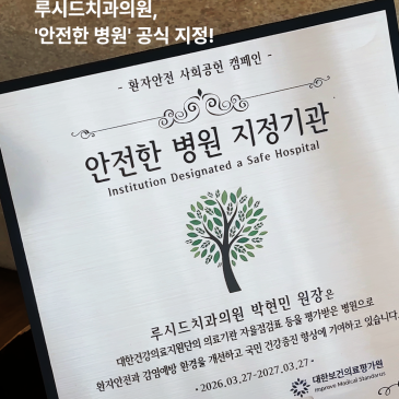 안녕하세요. 루시드치과입니다:) 저희 루시드치과가 2026년 3월 26일, 보건복지부 산하 '대한건강의료지원단'에서 운영하는 '안전한 기관 인증제'에 선정되어 공식 인증패를 수여받았습니다. 이번 인증은 단순한 결과가 아니라, 환자분들께 보다 안심할 수 있는 진료 환경을 제공하기 위해 지속적...