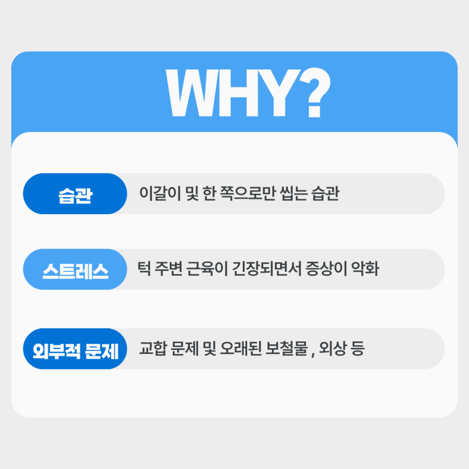 턱관절장애의 원인은 한 가지로 단정하기 어렵습니다.