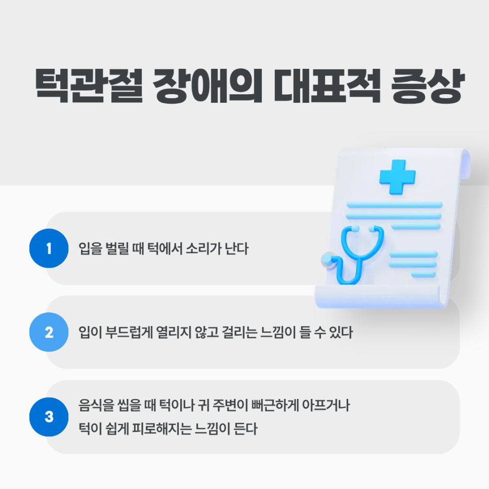 입을 벌리거나 음식을 씹을 때 턱에서 ‘딱’, ‘뚝’ 하는 소리가 나는 경우를 경험하는 분들이 많습니다. 처음에는 통증이 없어서 대수롭지 않게 넘기지만, 이러한 증상이 반복된다면 턱관절장애의 초기 신호일 수 있습니다. 턱관절은 귀 앞쪽에 위치한 관절로, 말하기·씹기·하품처럼 일상적인 움직임에 지속적으로 사용...