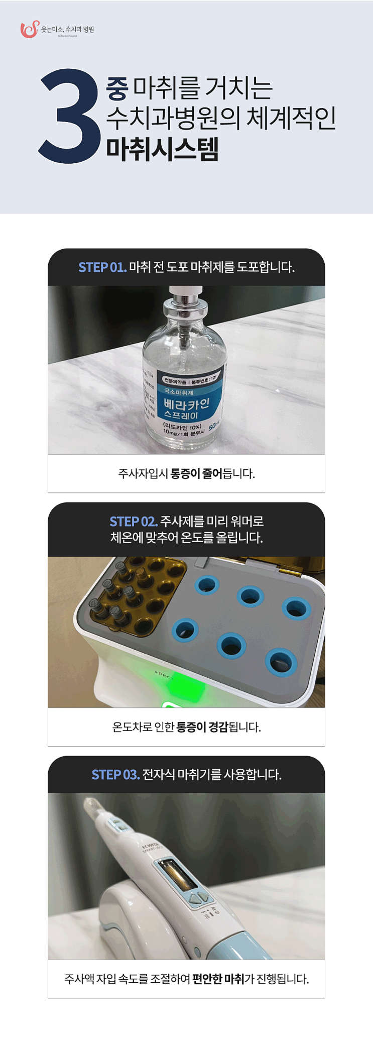 본원에서는 마취 시작 단계부터 고통을 관리하는 3중 마취 시스템을 통해 편안한 진료를 진행 중인데요.
