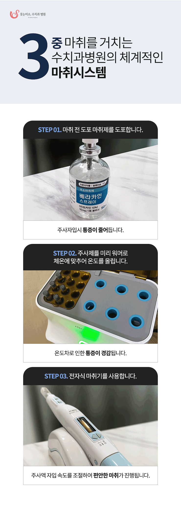 아무래도 치과를 무서워하는 이유 중에 큰 부분인데 저희는 3중 마취 시스템을 통해서 고통을 많이 줄여드리고 있습니다.