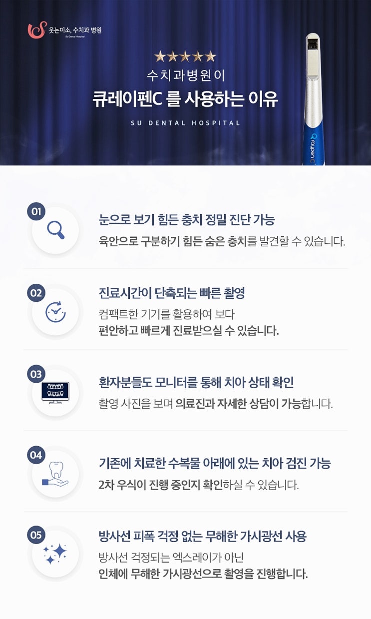 본원은 과잉진료를 사전에 방지하기 위해 Qray-C펜을 활용하여 광학 우식 탐지를 진행하고 있는데요.