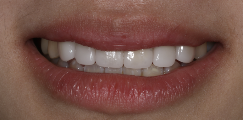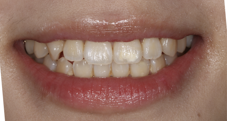 교정을 통해 치아는 어느정도의 자리를 잡았지만, 여전히 웃을때 모습이 심미적으로 조금 모자란 느낌.
