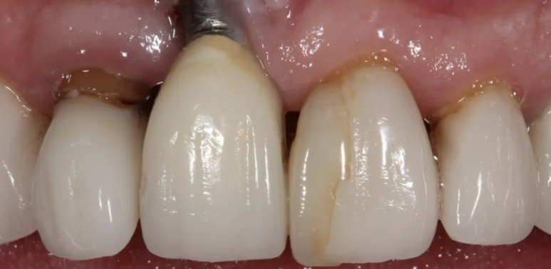 이런 케이스가 가장 안타까운 케이스인데요, 심어진 위치가 너무 잇몸 바깥쪽인 경우 몇 년 지나지 않아 잇몸이 퇴축되어 나사산이 노출되는 경우가 생긴답니다. 물론 정상적으로 심겼으나 임플란트 주위염이 너무 심해져서 생기는 경우도 있고요. 이런 경우 다시 잇몸 이식 및 뼈이식 등을 통해 다시 복원하는 방법도 있지만, 때로는 나사를 제거하고 다시 식립해야 하는 경우도 생기고요. 미국에서 일반 치과의사가 앞니 임플란트를 심었다가 저런 일이 생기는 경우 바로 소송 직행에 자칫 잘못하면 평생 쌓아 올린 치과의사 커리어가 한방에 끝나기 때문에, 앞니 임플란트는 더더욱 전문의에게 맡긴답니다. 500만 원 벌려다가 면허 날아가는 상황이 생길 수 있는 거죠.