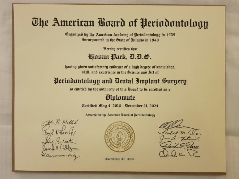 미국 치주과 및 임플란트 수술 전문의 인증서_대표원장 박호산