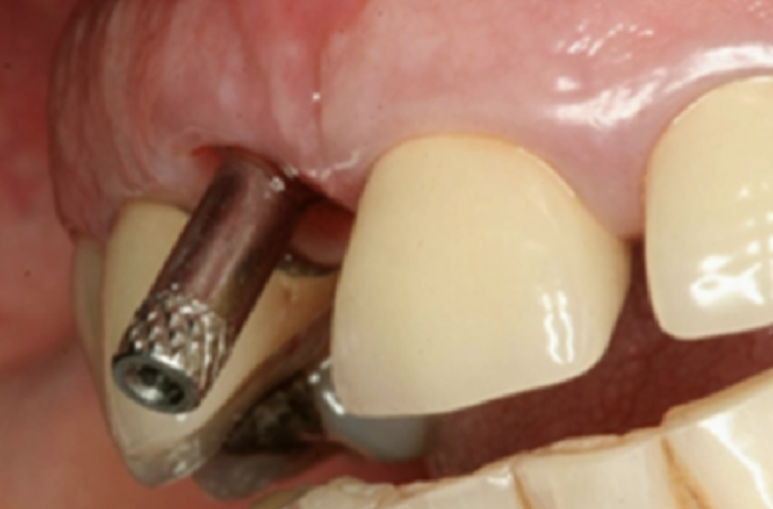 임플란트가 너무 순 측에 위치하여 뿌리 나사 부분이 잇몸 밖으로 노출된 경우