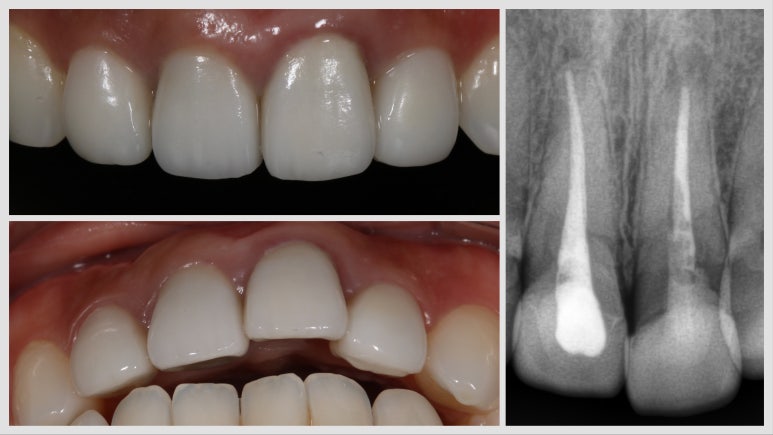 이 환자분의 경우 왼쪽 앞니 (사진상 오른쪽) 치아가 뿌리 쪽이 부러져서 내원하신 경우인데요. 위와 같이 뿌리 중간이 부러진 경우 더 이상 치아를 살리기 어려워서 발치 후 임플란트를 하게 된답니다.