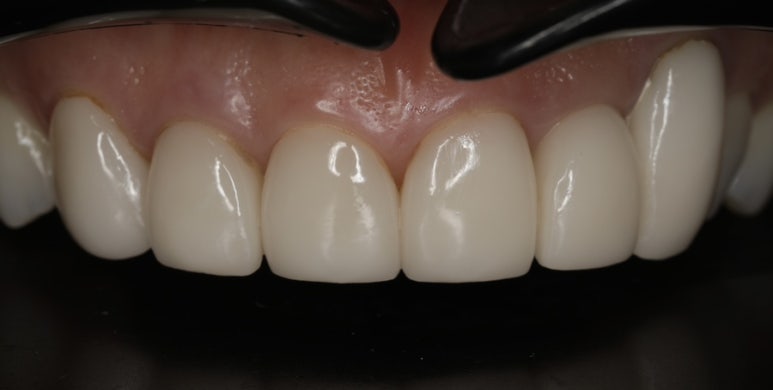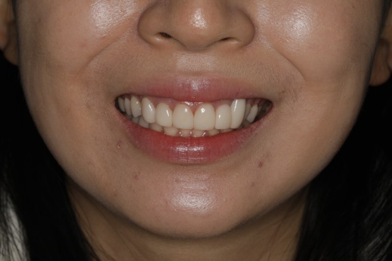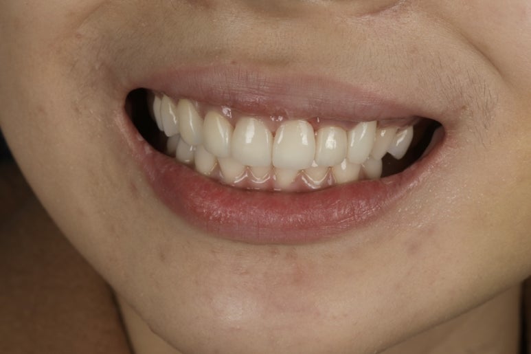 이렇게 잇몸을 내려서 반대편 송곳니와 대칭을 맞추었고요, 환자분의 바람대로 조금 더 자연치 색조에 맞게 B1 정도의 shade에 커스텀 스테이닝 작업을 통해 절단연 부분 자연치 투과도를 재현하도록 했답니다. 치아의 미세한 디자인 부분 또한 라인 앵글을 조금 더 살려서 인위적인 부분을 최대한 개선했습니다. 환자분은 매우 마음에 들어 하셨어요!