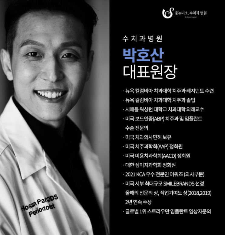 안녕하세요, 미국 보드 인증 치주과 및 임플란트 수술 전문의(US board-cerfitied periodontist and implant surgeon) 박호산 원장입니다.