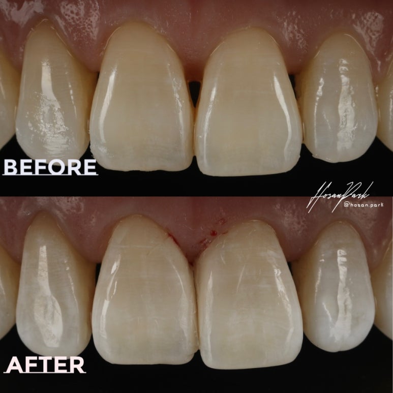 중절치 가운데 부분이 공간이 뚫려보이는 걸 ‘블랙 트라이앵글’ 이라고 하는데요, 이부분을 치아색상이 나는 레진 수복 재료를 통해 메꿔주는 치료를 하는 거죠. 환자분 요청에 따라 한 공간만 치료했지만, 다른 부분도 물론 가능하답니다.