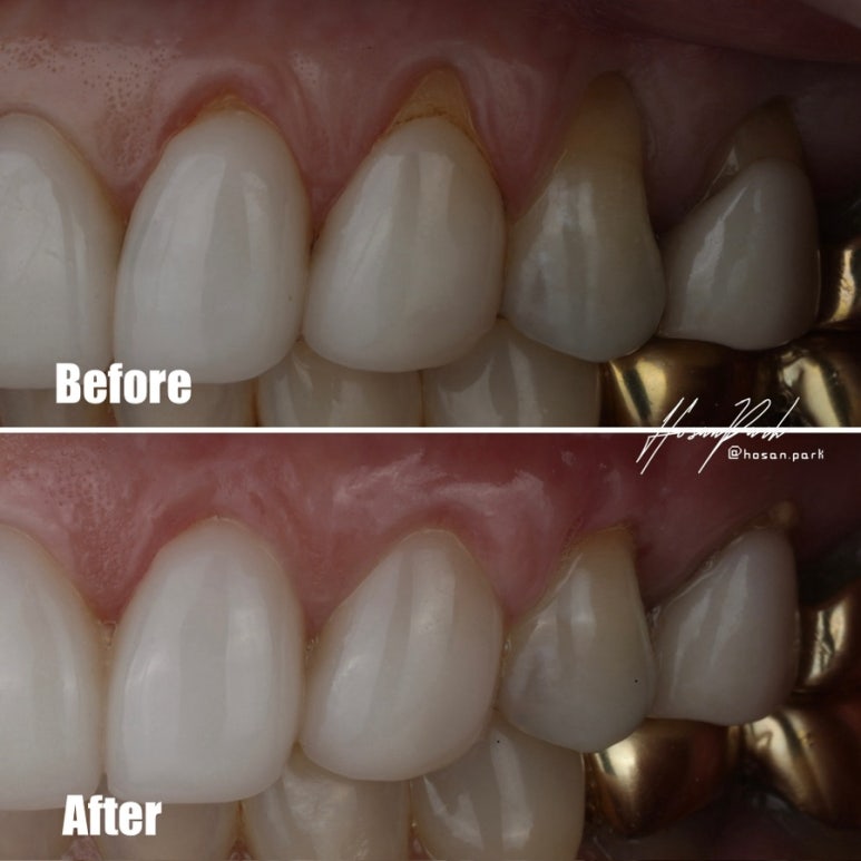 잇몸이 올라가서(혹은 내려가서) 뿌리가 노출되는 현상을 치은 퇴축, 내지는 잇몸 퇴축이라고 한답니다. 잇몸 이식술 수술 전후 위에 전 사진을 보시면 라미네이트 및 크라운 수복 등을 한 치아는 어디부터 뿌리인지 명확한 경계를 확인할 수 있답니다. 치아의 머리 부분과 뿌리 부분이 만나는 경계를 의학적 용어로 CEJ, ce...