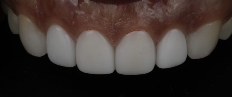 자세히 사진을 보시면 치아별로 색조가 고르지 못하고 얼룩덜룩한 모습, 측절치 색조가 다른 치아에 비해 밝고 나머지 중절치와 견치가 조금 어두운 부분이 관찰되었답니다. 물론 색에 예민하시지 않으신 분들은 원래 그래요, 하고 넘어가실 수도 있는데, 저희는 고민끝에 측절치 2개를 남겨두고 나머지 치아를 재시술 하기로 했답니다.