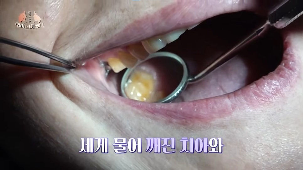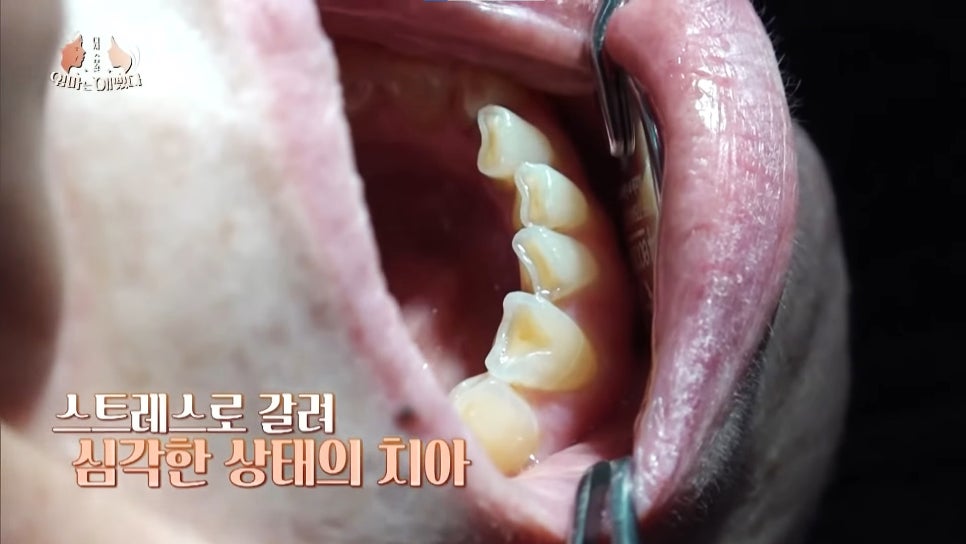 본론으로 돌아와서, 위 사진에서도 보실 수 있듯이 천안엄마의 치아 역시 많이 닳아 있는 상태(교모)였으며 치아가 패여서 상아질이 드러나는 치아 마모와 구치부가 깨지는 등 노화의 대표적인 증상들을 겪고 있었습니다.