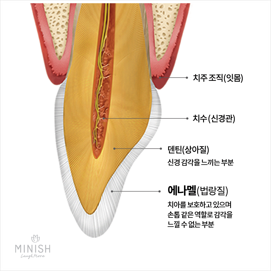 치아는 에나멜과 그 안에 덴틴(상아질), 치수(신경)으로 이루어진 복합체입니다.