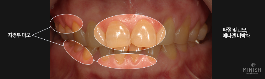 ● 질환: 어금니깨짐, 치아 닳음(교모), 치아 패임(마모), 전체적인 에나멜 비박화