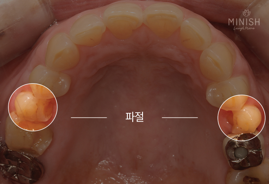 천안엄마는 치아노화의 대표적인 증상인 치아가 패이는 증상(마모)이 상당히 많이 진행되어 치아 속 상아질이 노렇게 드러나 있었으며 에나멜이 약해진 상태였습니다. 또한 어금니깨짐 즉, 파절로 인해 음식을 제대로 씹을 수 없었고 극심한 이시림 증상을 가지고 있었죠.