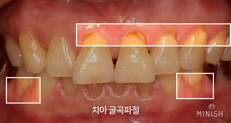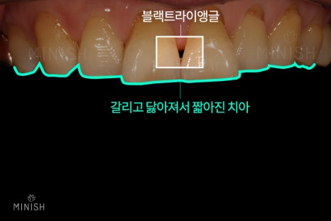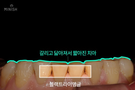 치아노화로 인한 치아교모와 잘못된 이갈이 습관 등으로 발생한 치아마모로 치아가 많이 짧아지고 블랙트라이앵글이 발생한 것을 볼 수 있습니다. 또한, 치아패임으로 일반 치아에 비해 치아 뿌리 부분이 패인 것도 확인이 가능합니다. 치아 겉면인 에나멜을 복구하여 치아를 보호하는 치료가 시급했는데요. 그래서 치아코팅기술인 미니쉬를 진행하기로 했습니다.
