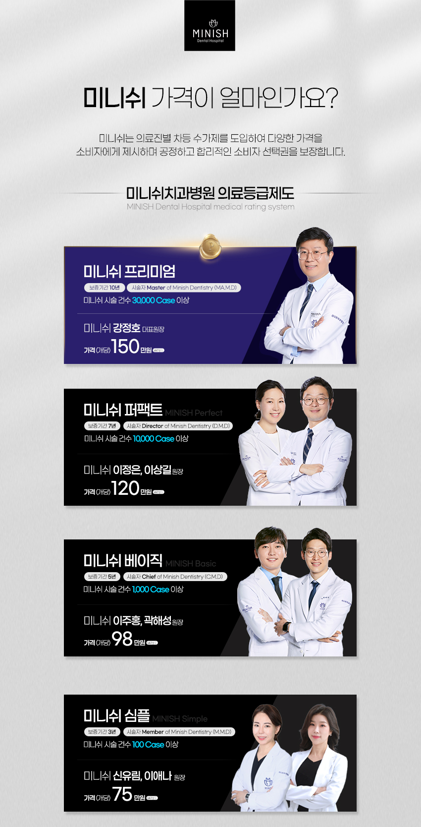 이 건강에 좋지 않으며, 영구적이지 않은 측면에서 치아미백가격이 합리적으로 다가오지 않을 수 있는데요. 미니쉬는 합리적인 가격을 제공합니다. 해당 치료는 술자의 기술이 영향을 끼치기에 임상경험별 등급과 그에 맞는 가격이 책정되어 있습니다. 그중 미니쉬치과병원은 다양한 미니쉬 등급과 최다 임상케이스를 보유하고 있어, 75만원부터 150만원까지 다양한 가격대를 제시하고 있습니다.