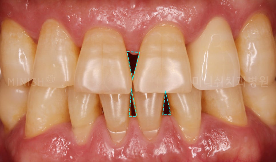 일반적으로 교정치료를 받고 난 뒤 공간이 생기는 경우가 많습니다. 겹쳐지고 울퉁불퉁하던 치아가 가지런히 재배열되면서 역삼각형의 공간이 드러나게 되는 것이죠.