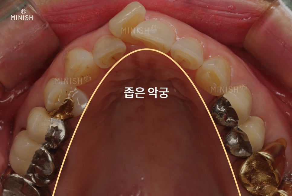 악궁이 좁으니 원래 치아 크기가 들어갈 공간이 없었기에 남은 공간을 비집고 앞니가 툭 튀어나온 것입니다.