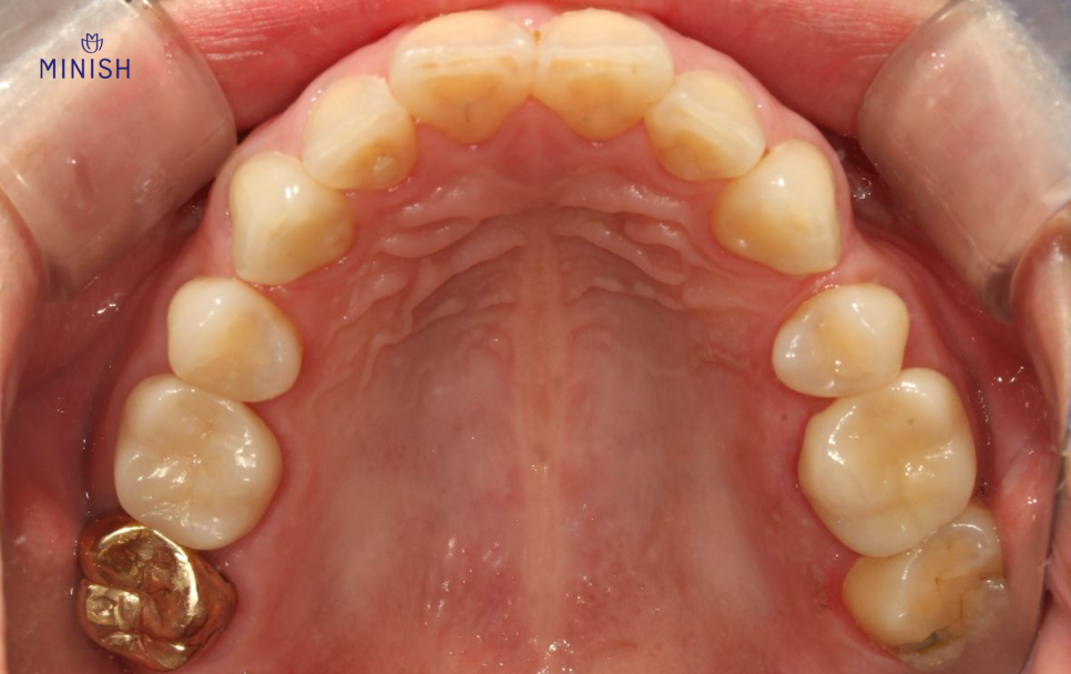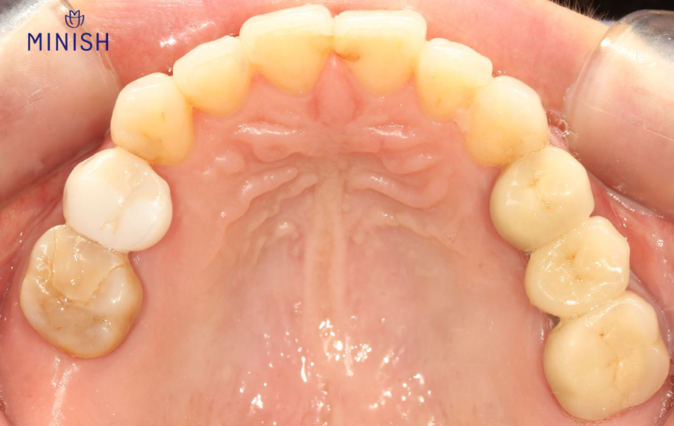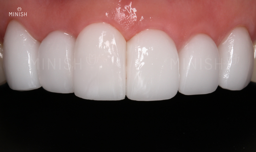 가지런하게 배열을 개선하는 것을 목표로 치료를 진행했습니다. 우선 두 앞니의 치아 높낮이가 달랐기 때문에 최대한 밸런스를 맞추기 위한 잇몸절제술을 진행, 회전되어서 튀어나온 부위만을 다듬고 미니쉬를 진행했습니다.