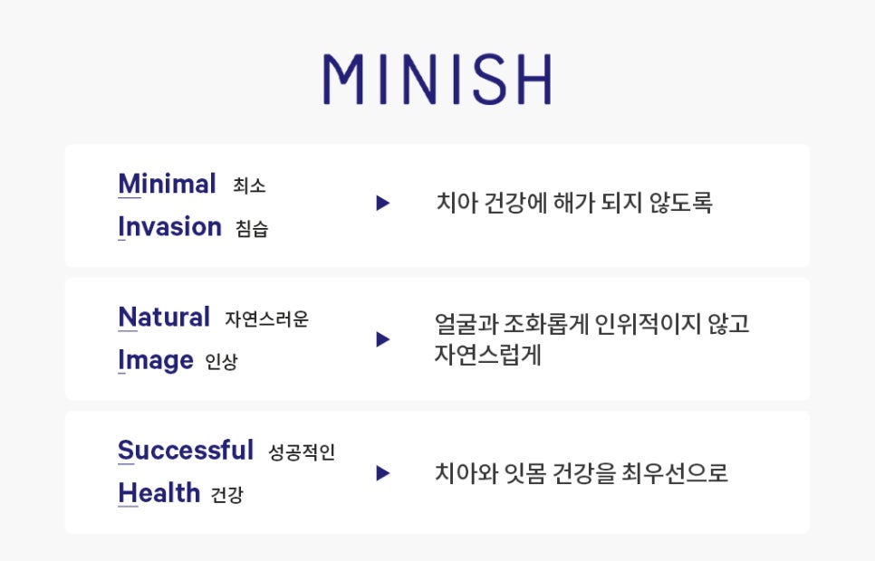 미니쉬란 치아 건강을 목적으로 탄생한 솔루션입니다. 그렇기에 치아의 손상된 부위만을 다듬어 자연치아를 최대한 살리고 있죠. 또한, 2차 우식으로 인해 자연치가 망가지지 않도록 표면을 다듬는 작업을 통해 미니쉬와 자연치아의 결합력을 높였습니다. 그렇기에 탈락의 우려도 적습니다.