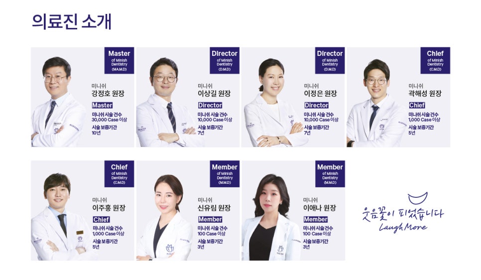 유일한 마스터 등급이자 미니쉬 개발자인 강정호 대표원장과 등급별 의료진이 가장 많이 상주해 있는 곳이죠. 등급별 의료진의 포진은 소비자분들의 선택의 폭이 넓으며, 가장 많은 미니쉬 솔루션을 진행했다는 의미인데요.
