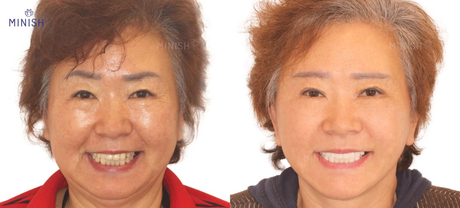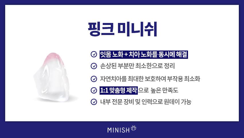 핑크미니쉬는 노화나 잇몸병에 의해 잇몸이 꺼지고 이가 길어보이는 경우 적용되는 솔루션입니다.