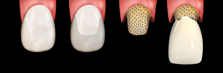 손상되어 코팅이 필요한 부분만을 대상으로 하기 때문에 자연치의 상태를 최대한 보존하면서도 튼튼하게 이를 보호할 수 있다는 것이 큰 장점이죠. 아주 얇은 미니쉬는 최소한의 표면정돈 과정을 거친 후 바로 부착이 가능합니다. 표면정돈 과정은 우수한 결합을 위해서 반드시 필요합니다.