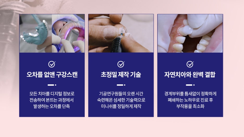 최첨단 재료와 장비에 의해 자연치아와 가장 유사한 성질 및 형태로 기공될 수 있죠. 여기에 지속적인 연구를 통해 나날이 발전하는 치아 코팅 기술과 세라믹 치료만을 위해 교육받고 양성되는 의료/기공인력이 합쳐져 미니쉬 솔루션이 완성됩니다.