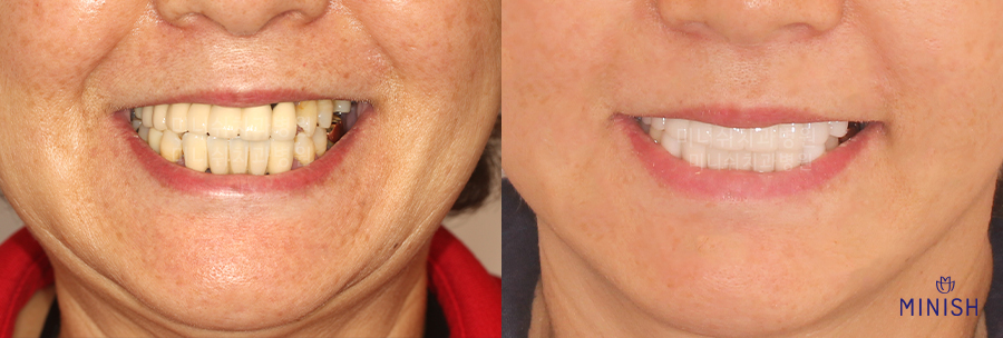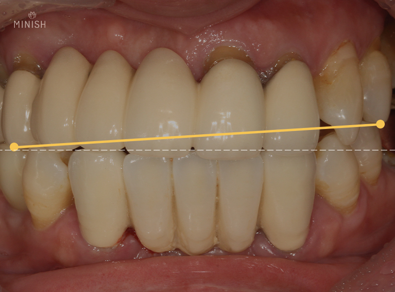 중년여성인 위 사례자분은 오래 전 진행한 크라운브릿지 보철물이 문제를 일으켜 극심한 통증과 스트레스를 호소했습니다. 치면과 치과보철물 사이의 결합이 정밀하지 못해 시간이 갈 수록 구강 내에 세균 감염 등 문제를 일으킨 것이죠. 육안으로도 자극과 염증으로 인해 붉게 부어있는 잇몸을 확인하실 수 있습니다. 뿐만 아니라 검게 변색이 되기도 했죠? 우측 사진을 보시면 전체치열의 가로축이 삐뚤어져 있는 모습도 보입니다.