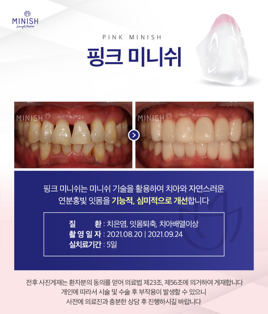 핑크 미니쉬는 치아와 자연스러운 연분홍빛 잇몸을 심미적으로 개선하며 잇몸 건강 관리에도 탁월한 구강 환경을 만드는 장점을 가지고 있습니다.