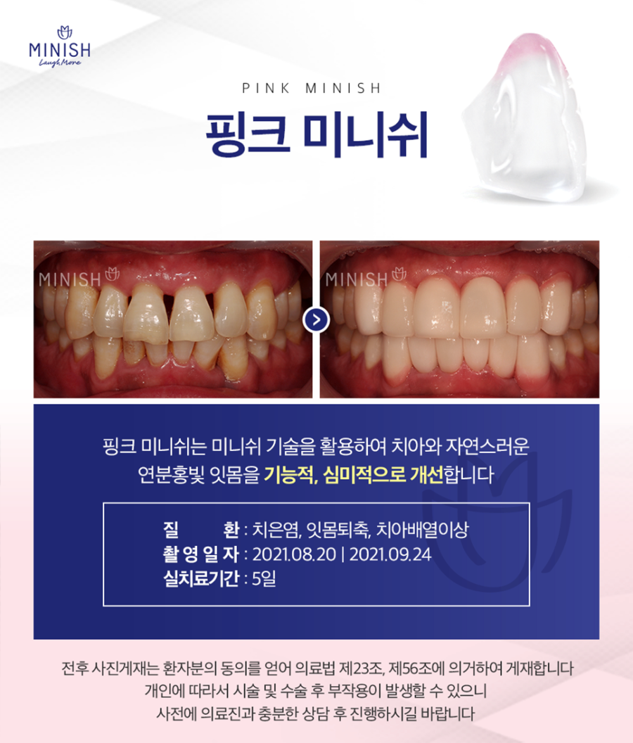 심미적 개선에 효과적인 핑크 미니쉬는 잇몸 건강 관리에 탁월한 구강 환경을 만들며, 잇몸의 형태를 재현해서 심미적 복원이 가능합니다.