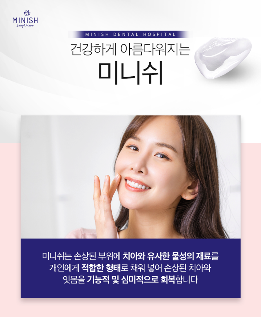 치아 건강과 아름다움을 모두 고려하여 탄생한 미니쉬는 노화나 외상으로 인해 잃어버린 치아 건강을 다시 채워주고 심미적인 기능 역시도 되돌려주는 치아코팅진료입니다.