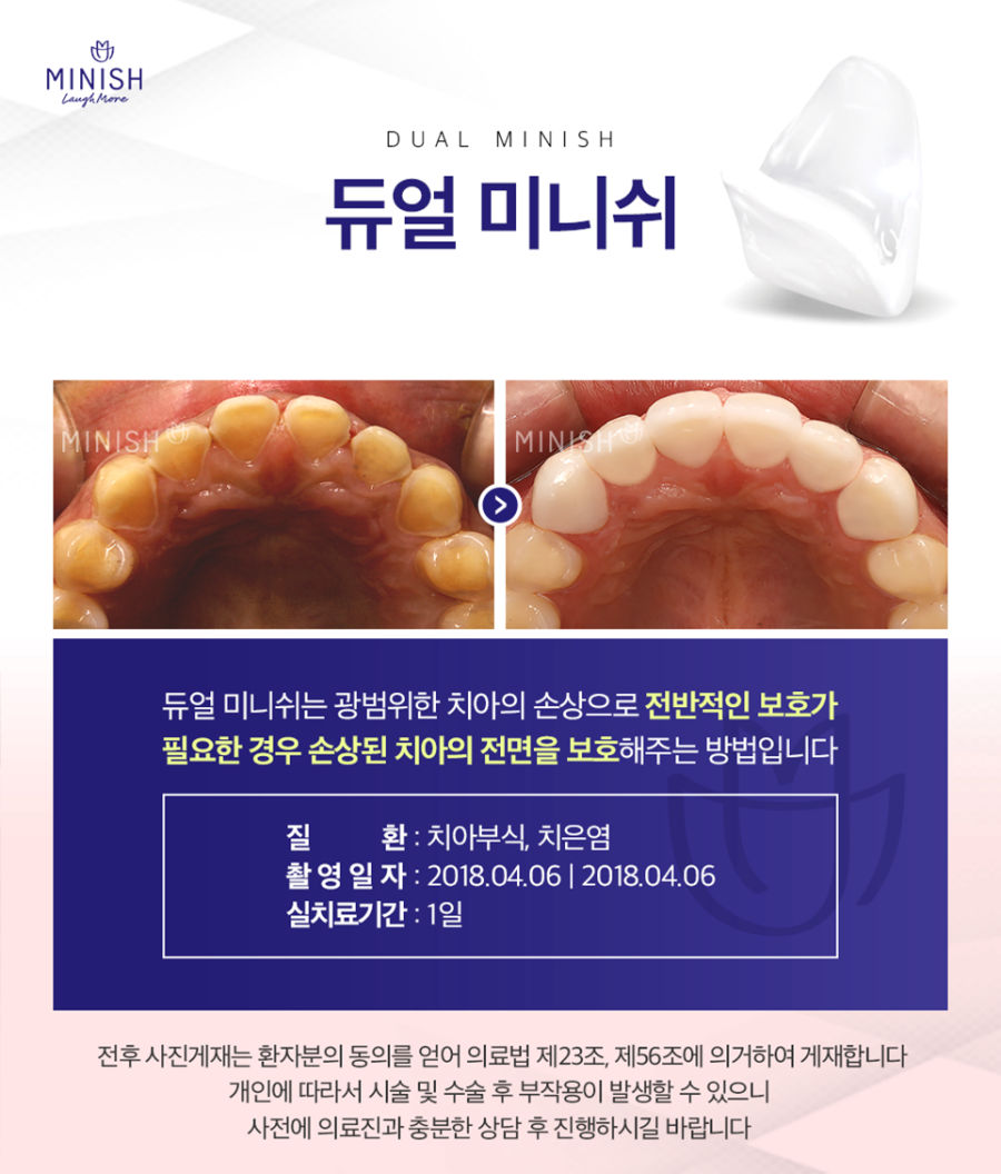 듀얼 미니쉬는 앞니의 손상이 광범위한 경우에 적합한 선택지로 개선이 필요한 부분만을 회복시킵니다.