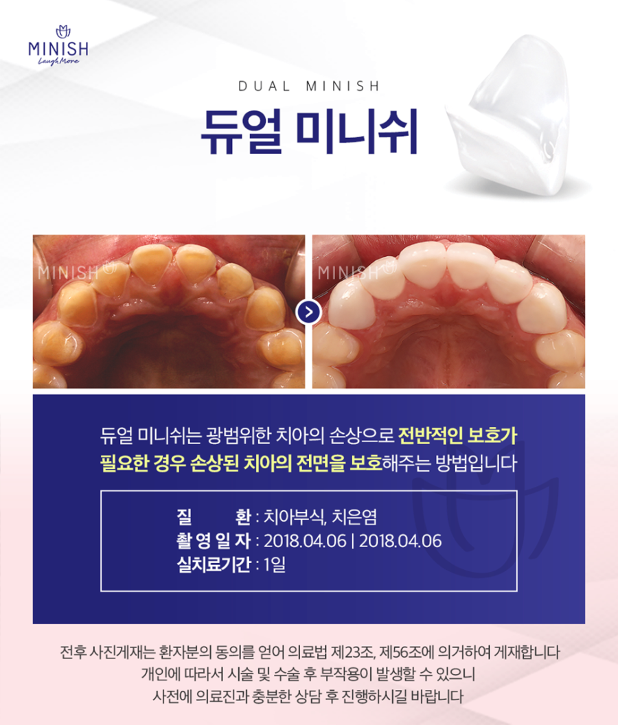 논현동치과는 광범위한 치아 손상으로 치아의 전반적인 보호가 필요한 경우 듀얼 미니쉬를 권해드리고 있습니다.
