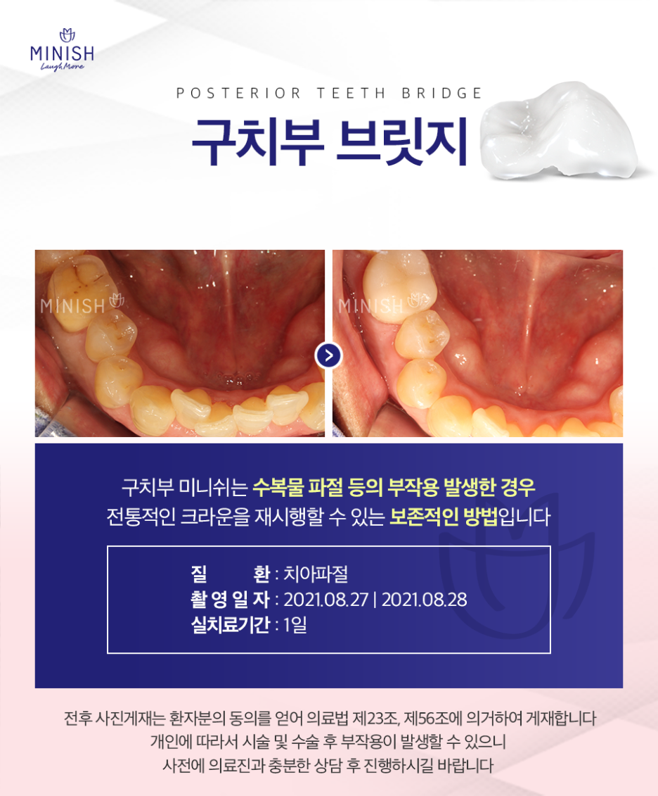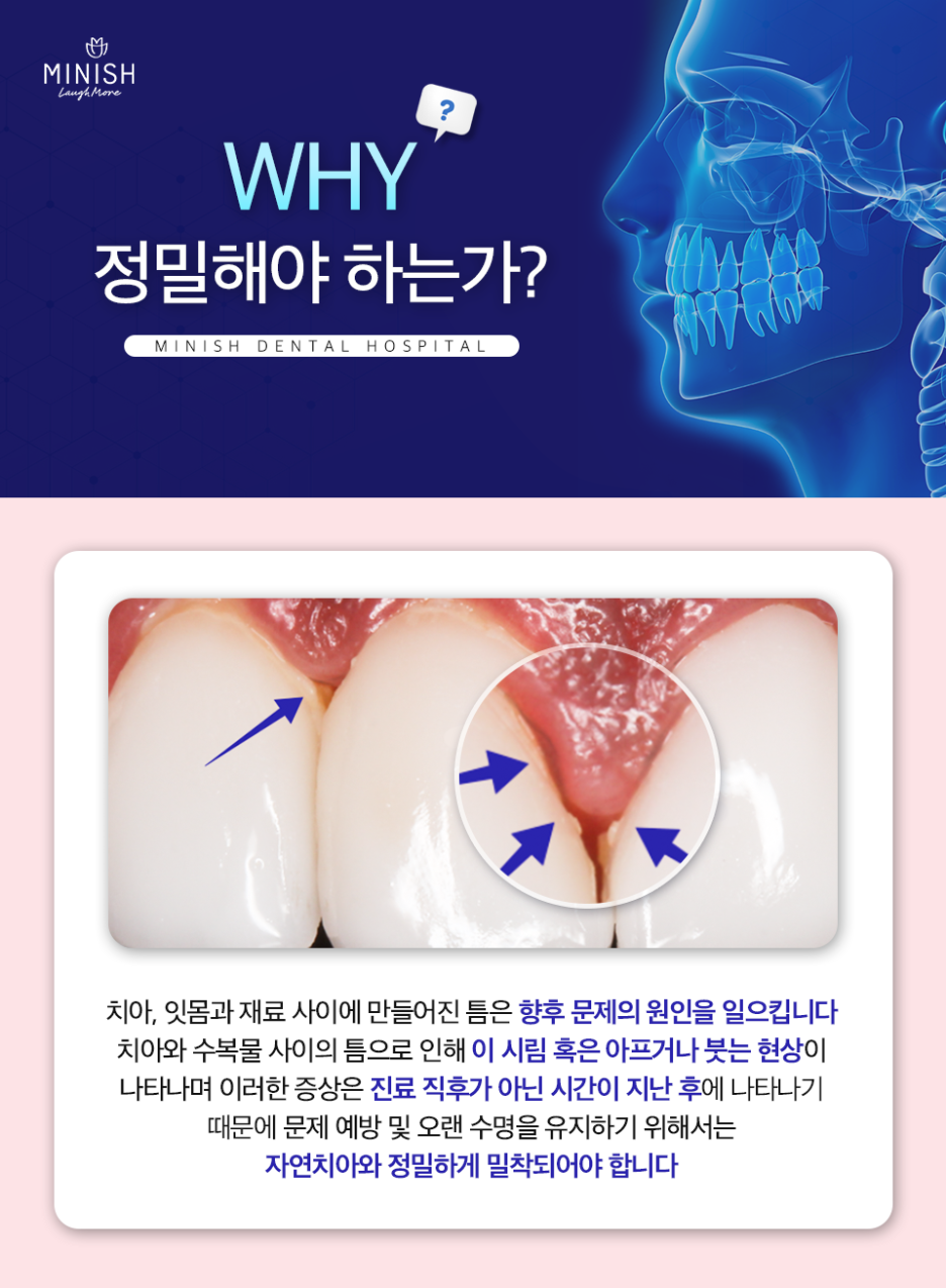 또 미니쉬 진행에 앞서 개인의 치아 상태나 구조, 손상된 범위 등을 꼼꼼히 따져보는 정밀 검진 과정을 거치게 됩니다.