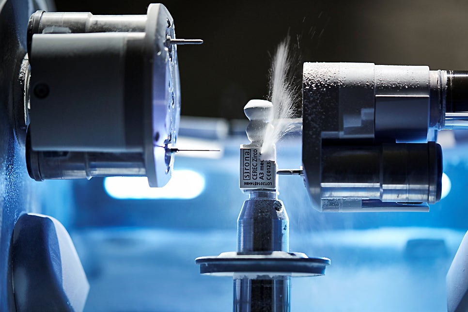 디자인이 완료되면 3D 프린터를 이용해 치아 모형을 제작하고 이를 토대로 미니쉬블록을 한 치의 오차가 없는 밀링머신을 사용해 1차 가공에 들어갑니다. 밀링 방식의 경우 굽거나 굳히는 것이 아닌 고체 형태의 블록을 깎는 것이기 때문에 변형과 오차에서 자유롭습니다.