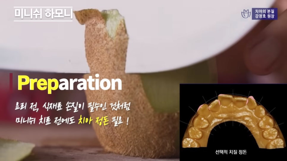 좀 더 설명하자면 자연치아의 표면은 균일하지 않아 최소한의 치아 정돈이 이루어져야 치아와 미니쉬가 완전하게 결합할 수 있기 때문에 꼭 필요한 과정인 셈이죠.