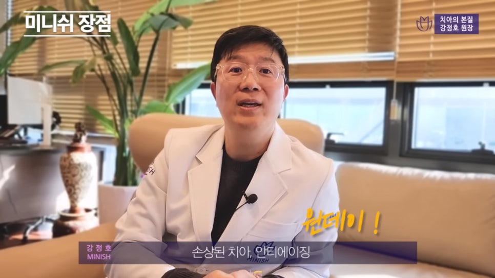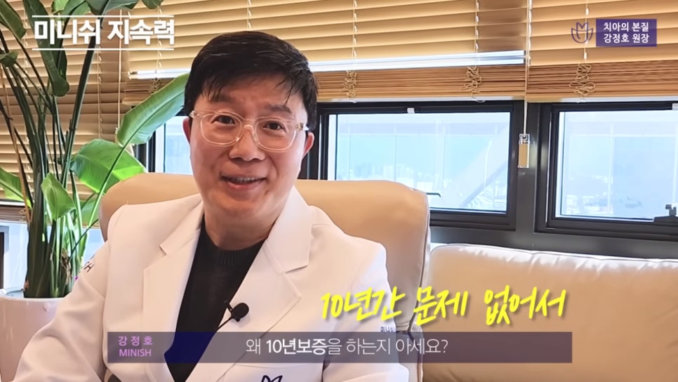 강 원장: 가장 중요한 질문이 아닐까 하는데요. 현재 미니쉬하모니 솔루션은 최장 10년을 보증하고 있습니다. 수많은 임상케이스를 통해 10년 동안 미니쉬 부작용으로 문제가 된 적이 없음을 확인했기 때문이죠.