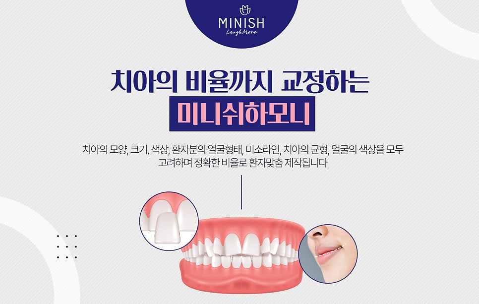 미니쉬하모니는 미니쉬와 동일하게 치아의 건강을 회복한다는 것을 목적에 두고 동시에 치아의 배열을 가지런하게 만드는 치아솔루션이에요. 일반적인 미니쉬와 동일하게 핸드폰의 강화유리처럼 얇고 자연치아와 유사한 물성을 가진 튼튼한 미니쉬를 치아에 틈새 없이 씌워 보호해 주는 것이에요.