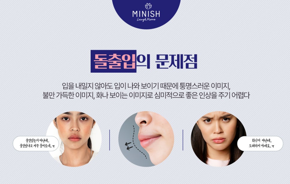 이 이외에도 입을 내밀지 않아도 입이 나와 있기때문에 자칫하면 부자연스럽고, 퉁명스러운 이미지, 불만이 가득한 이미지로 보일 수 있어 상대방에게 화가나있는 인상으로 보이는 문제점이 있어 돌출입을 개선하고자 하시는 분들이 많아요.