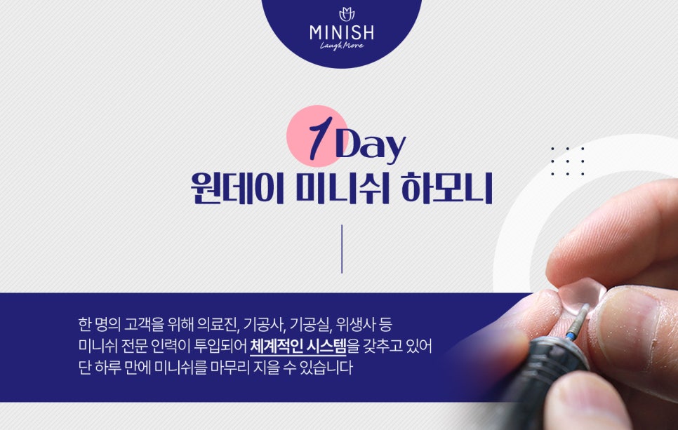 특히 한 명의 고객을 위해 의료진, 기공사, 기공실, 위생사 등 미니쉬 전문 인력이 투입되어 체계적인 시스템을 갖추고 있어 단 하루 만에 미니쉬를 마무리 지을 수 있습니다.