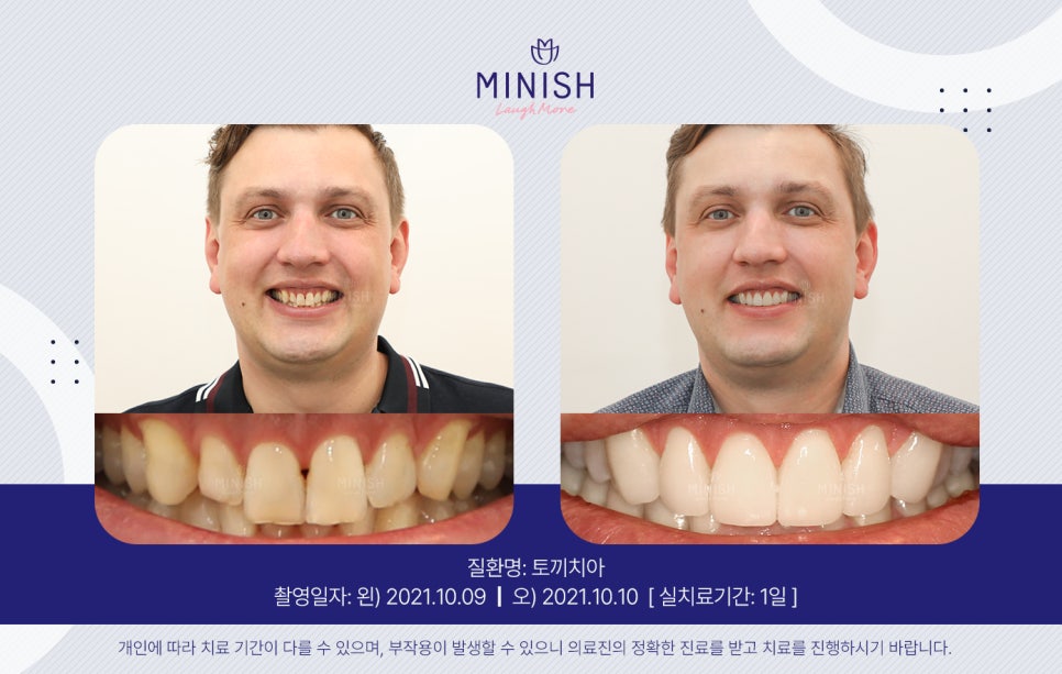 또한 잇몸이 약한 경우 일반 교정이 어려운 경우가 많은데 미니쉬하모니는 잇몸이 약한 경우에도 솔루션을 진행할 수 있으며, 대부분의 케이스의 경우 원데이로 솔루션을 마무리 지을 수 있기 때문에 앞니교정 시간, 방문 횟수 등으로 부담감을 느끼셨던 경우 미니쉬치과병원에서 미니쉬하모니를 통해 앞니 치열을 개선하는 것을 추천드려요.