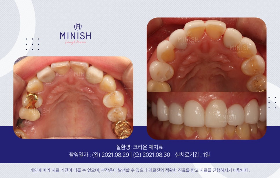 이미 크라운을 받은 치아이고 잇몸이 내려가 수복물의 변연(마진)이 노출됐거나 내부 치아의 변색으로 인한 잇몸 색의 변화, 세균 침투로 인해 이차 충치나 잇몸 염증으로 극심한 통증 발생 등으로 보철물 교체 즉, 크라운 재치료가 시급하다면 미니쉬 솔루션이 그 대안이 될 수 있습니다.