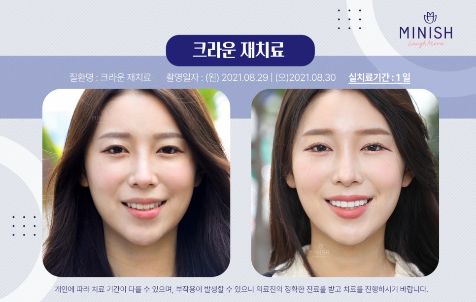 그러니 잇몸라인을 디자인하고 자연치아와 강도 마모도가 유사한 미니쉬로 오래된 크라운의 변색, 통증 스트레스에서 벗어나시길 바라겠습니다. 오래된 크라운, 혹은 기타 보철물 재치료가 시급하다면! 미니쉬치과병원에서 언제든 정확하고 친절한 상담을 도와드리도록 하겠습니다. 감사합니다.