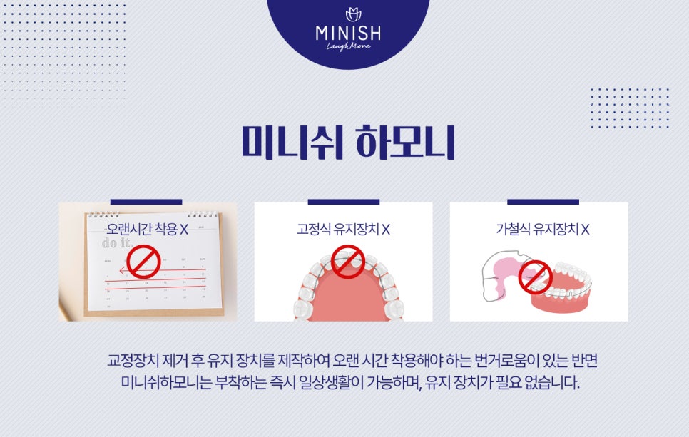 이 이외에도 미니쉬하모니는 교정장치 제거 후 유지 장치를 제작하여 오랜 시간 착용해야 하는 번거로움 없이 즉시 일상생활이 가능합니다. 또한 환자의 치아에 꼭 맞도록 계획되고 제작되어 미니쉬를 부착한 후 다듬는 과정이 없습니다.