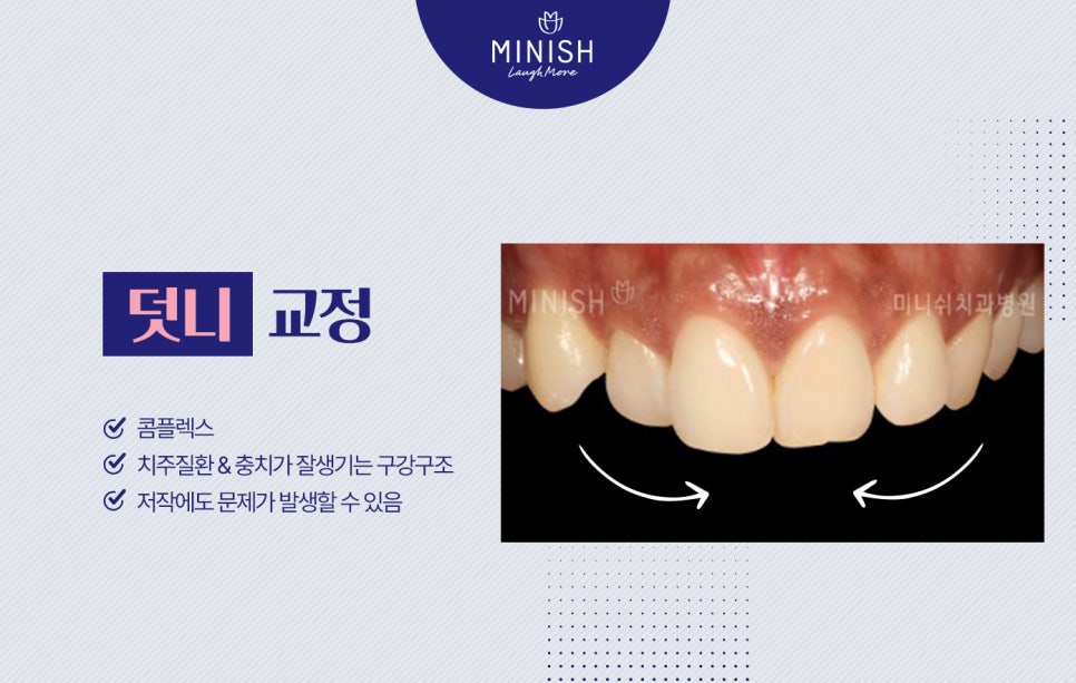 턱뼈의 크기에 비하여 치아의 크기가 비교적 크거나 턱뼈에 공간이 부족하여 제 위치가 아닌 다른 곳에 치아가 맹출 하는 것을 덧니라고 합니다. 덧니는 심미적인 면에서 예쁘거나 가지런하지 않아 콤플렉스가 되기도 하지만 덧니는 치주 질환, 충치 등이 쉽게 생기는 구강구조이며, 기능적인 면에서 저작에도 문제가 발생할 수 있어 배열을 바르게 해주는 것이 좋습니다.