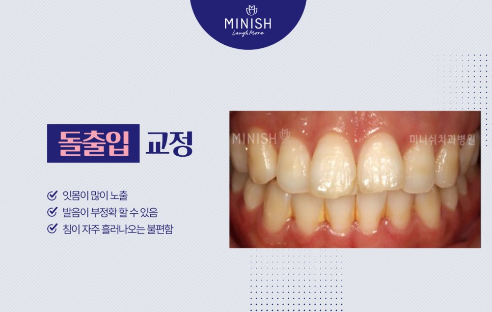 돌출입은 앞니와 잇몸이 유난히 앞쪽으로 튀어나온 치아 구조를 말합니다. 옆에서 보았을 때 입이 코보다 많이 나온 형태를 우리는 돌출입이라고 부릅니다. 웃을 때 그리고 말을 할 때 잇몸이 많이 노출되며 입이 잘 다물어지지 않아 발음이 부정확하며, 다물어지지 않는 입에 의해 침이 자주 흘러나오는 불편함을 가지고 계신 분들도 많습니다.
