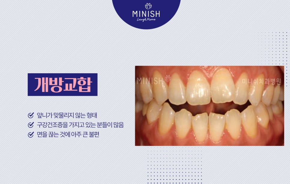 다소 일반인 분들에게는 생소한 용어 일 텐데요 쉽게 설명을 드리면 어금니끼리 지라를 맞대고 물었을 때 앞니가 맞물리지 않는 형태를 개방교합이라고 합니다. 개방교합을 가지고 계신 분들의 경우 면을 끊는 것에 큰 불편을 느끼며, 앞니가 맞물리지 않고 떠있기 때문에 입안이 자주 마르는 구강건조증을 가지고 있는 분들이 많습니다. 또한 말을 할 때 발음이 새어 대화를 하는 것을 꺼려 하는 분들도 있습니다.